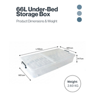 The 66L Underbed Storage Box is designed to maximize your storage space while fitting neatly under beds and furniture. With its slim profile and clear design, it keeps your items organized, visible, and protected without taking up extra room.