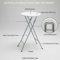 The 60CM Round Cocktail Table is designed for stylish gatherings, casual conversations, and elevated entertaining. Lightweight, sturdy, and easy to fold, it’s the perfect choice for balconies, terraces, events, cafés, and standing receptions. Made with a durable HDPE tabletop and reinforced steel frame, this cocktail table blends practicality with modern simplicity—ideal for both indoor and outdoor use.