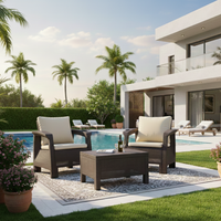 Crafted from high-quality weather-resistant polypropylene, the set is built to withstand heat, sun exposure, and humidity. The dark brown frame is paired with soft beige back and seat cushions, creating a warm, inviting aesthetic that’s easy to maintain. Built-in cup holders on the chairs add a practical touch, making it ideal for casual lounging, coffee breaks, or entertaining guests.